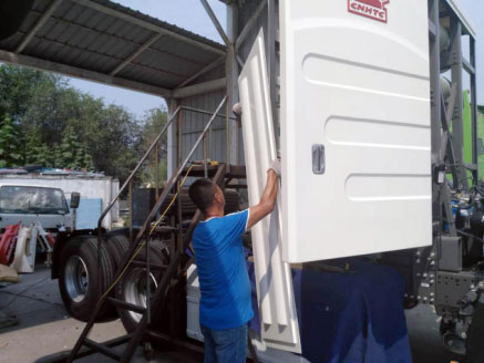 本公司依據(jù)顧客提供的氣瓶支架設(shè)計氣瓶罩尺寸,保證高度及寬度不超出駕駛室;氣瓶罩左右兩側(cè)設(shè)計開門,不帶小門,同時設(shè)計配套鉸鏈、限位以及門鎖;通風(fēng)設(shè)計為百葉窗樣式,保證有良好的通風(fēng)效果;造型設(shè)計時尚、大氣、簡約與駕駛室造型相吻合,氣瓶罩外表面帶有重汽logo。設(shè)計完全滿足顧客的要求。