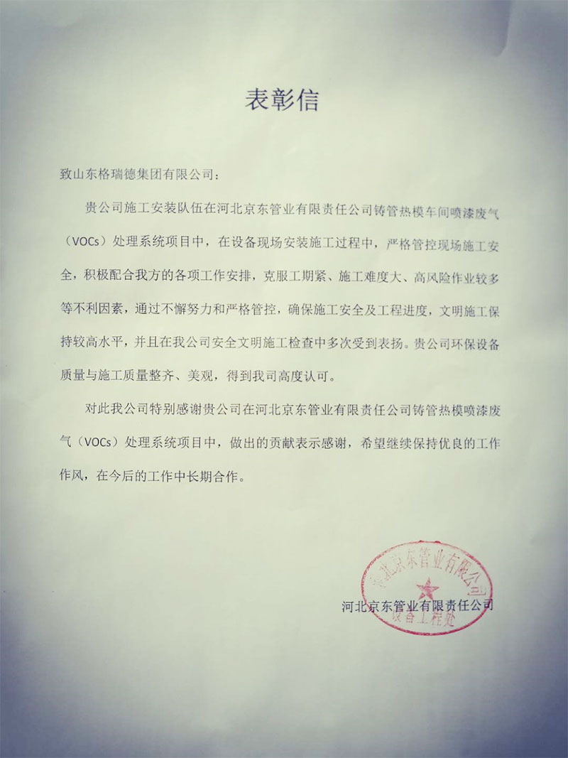 山東格瑞德集團(tuán)環(huán)保工程公司為河北京東管業(yè)有限公司VOCs治理,在工程中,山東格瑞德集團(tuán)環(huán)保工程公司全程參與VOCs治理施工過程。格瑞德一直秉承著“質(zhì)量管理零失誤、產(chǎn)品質(zhì)量零缺陷”的理念,在產(chǎn)品制造上精益求精。此次為河北京東管業(yè)有限公司VOCs治理,能夠充分的體現(xiàn)環(huán)保工程公司的整體實(shí)力,保障環(huán)保設(shè)備高效穩(wěn)定地運(yùn)行。