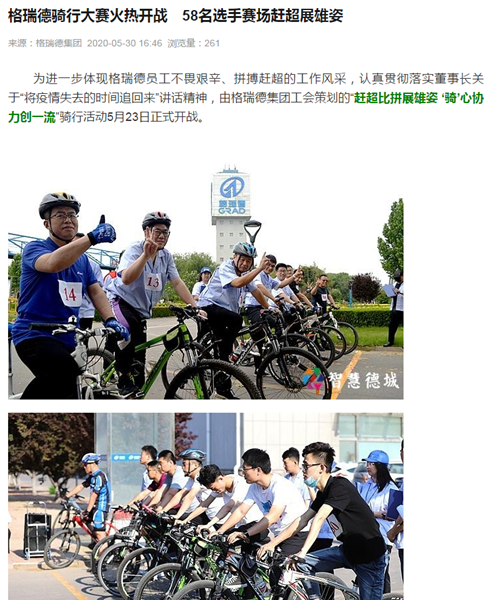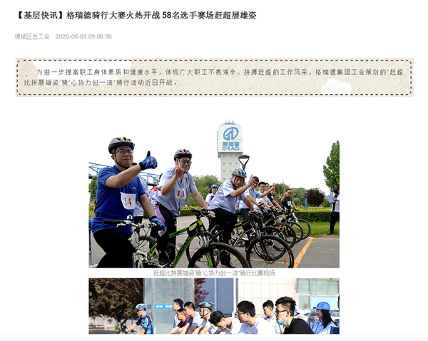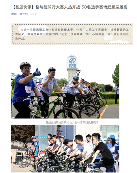 為進(jìn)一步體現(xiàn)格瑞德員工不畏艱辛、拼搏趕超的工作風(fēng)采,認(rèn)真貫徹落實(shí)董事長關(guān)于“將疫情失去的時(shí)間追回來”講話精神,由格瑞德集團(tuán)工會(huì)策劃的“趕超比拼展雄姿 ‘騎’心協(xié)力創(chuàng)一流”騎行活動(dòng)5月23日正式開戰(zhàn),多家媒體、宣傳載體對(duì)本次活動(dòng)競(jìng)相報(bào)道及轉(zhuǎn)載,包括智慧德城、齊魯工惠、德城工會(huì)在線等。