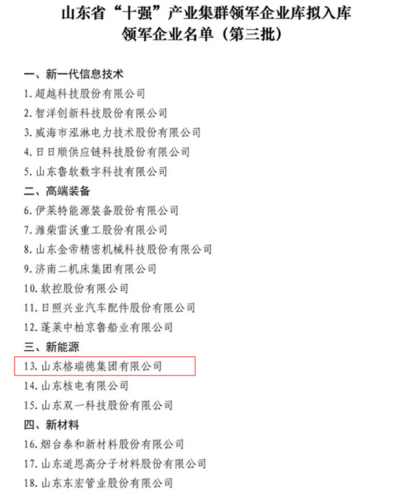 按照全省新舊動(dòng)能轉(zhuǎn)換“五年取得突破”工作方案和《“十強(qiáng)”產(chǎn)業(yè)“雁陣形”集群培育支持辦法》《“十強(qiáng)”產(chǎn)業(yè)集群領(lǐng)軍企業(yè)培育支持辦法》有關(guān)要求,近期,省發(fā)展改革委會(huì)同有關(guān)部門公布了2021年度入庫(kù)培育的“十強(qiáng)”產(chǎn)業(yè)“雁陣形”集群和集群領(lǐng)軍企業(yè)名單(第三批),山東格瑞德集團(tuán)有限公司(新能源)入選山東省“十強(qiáng)”產(chǎn)業(yè)集群領(lǐng)軍企業(yè)庫(kù)。