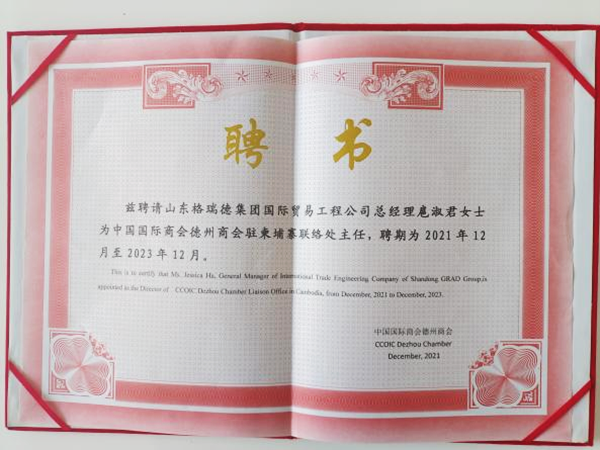 中國國際商會是經(jīng)中國國務(wù)院批準(zhǔn),于1988年成立的全國性商會組織,業(yè)務(wù)指導(dǎo)單位是中國貿(mào)促會,現(xiàn)有會員7.8萬家。中國國際商會德州商會作為中國企業(yè)投資柬埔寨的服務(wù)者,在格瑞德集團成立柬埔寨辦事處,旨在更好地連接中柬資源,讓中柬合作走深走實,積極服務(wù)德州企業(yè)“請進(jìn)來”、“走出去”,進(jìn)一步開拓柬埔寨市場,擴大貿(mào)易合作。