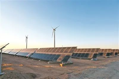 當新能源遇見演兵場,大漠“風光”無限。藍天白云下,無垠大漠上,數(shù)臺風機與成片太陽能發(fā)電板遙相呼應。