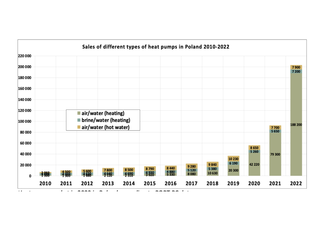 2022年,波蘭銷售的空氣-水熱泵數量比2021增加了137%,達到188200臺。這意味著在過去10年中,波蘭的空氣-水熱泵市場增長了100多倍。