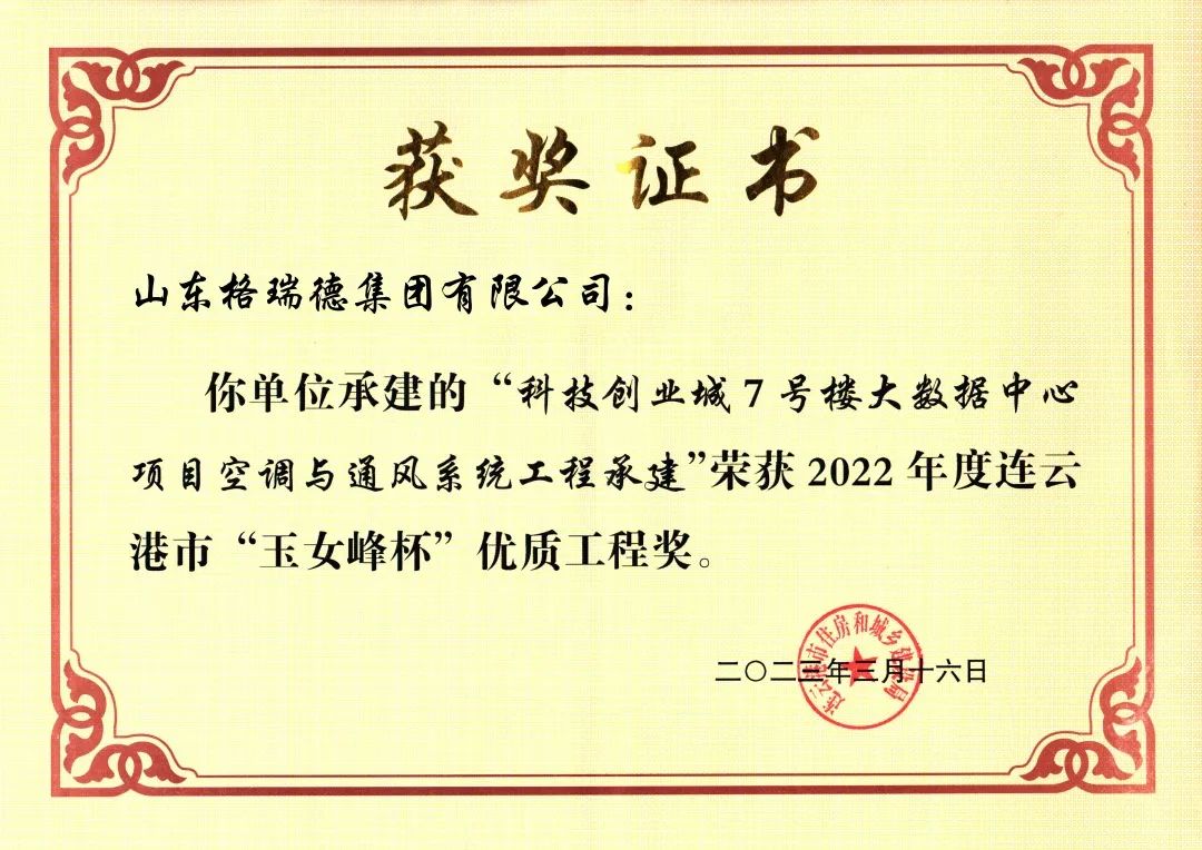 近日,格瑞德集團簽訂的“科技創(chuàng)業(yè)城7號樓大數據中心項目空調與通風系統(tǒng)”項目,榮獲連云港市“玉女峰杯”優(yōu)質工程獎。
