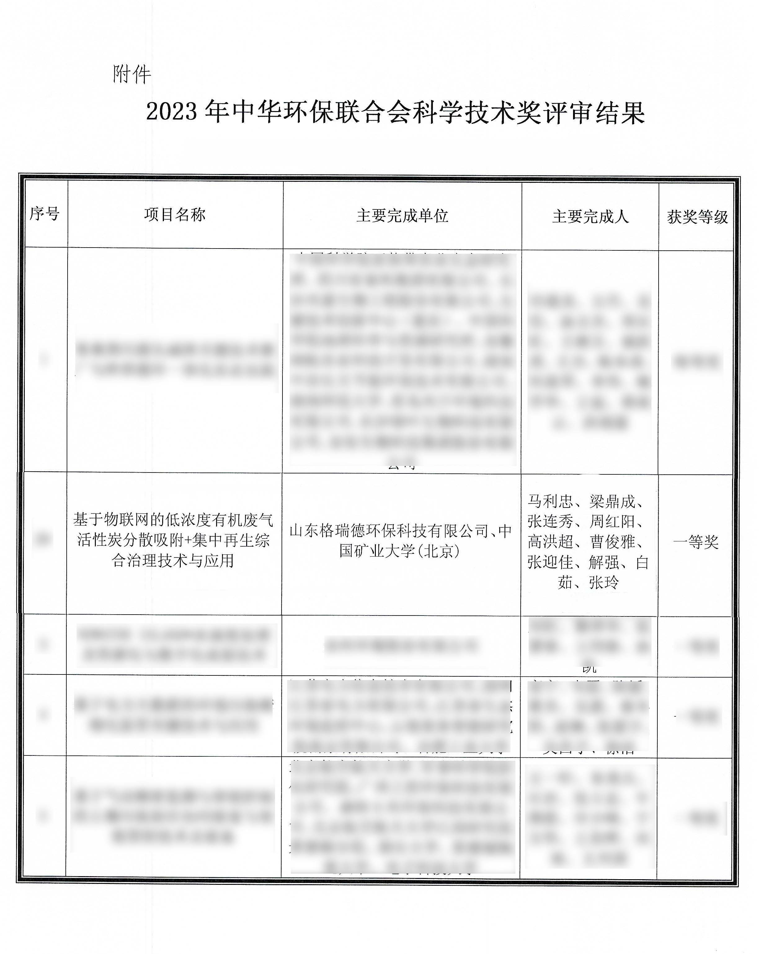 近日,中華環(huán)保聯(lián)合會(huì)公布《關(guān)于公示2023年度科學(xué)技術(shù)獎(jiǎng)評(píng)審結(jié)果的公告》,由山東格瑞德環(huán)??萍加邢薰尽⒅袊?guó)礦業(yè)大學(xué)(北京)聯(lián)合申報(bào)的《基于物聯(lián)網(wǎng)的低濃度有機(jī)廢氣活性炭分散吸附+集中再生綜合治理技術(shù)與應(yīng)用》項(xiàng)目榮獲2023年度中華環(huán)保聯(lián)合會(huì)科學(xué)技術(shù)獎(jiǎng)一等獎(jiǎng)。