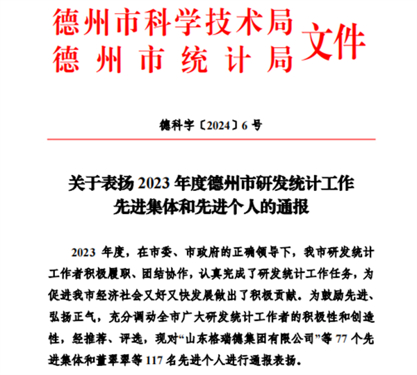 2月,德州市科學(xué)技術(shù)局、德州市統(tǒng)計(jì)局聯(lián)合召開2024年度德州市研發(fā)統(tǒng)計(jì)工作會(huì)議。會(huì)議公示表揚(yáng)了2023年度研發(fā)統(tǒng)計(jì)工作先進(jìn)集體和先進(jìn)個(gè)人。格瑞德集團(tuán)憑借卓越的研發(fā)創(chuàng)新實(shí)力,成功榮獲“研發(fā)統(tǒng)計(jì)工作先進(jìn)集體”稱號(hào)。