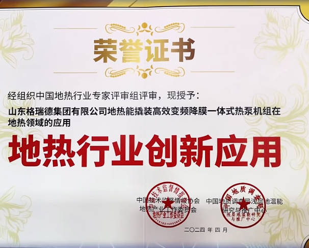 4月,格瑞德集團(tuán)受邀參加2024四川(成都)地?zé)岣哔|(zhì)量發(fā)展大會(huì),會(huì)上集團(tuán)憑借地?zé)崮芮搜b高效變頻降膜一體式熱泵機(jī)組在地?zé)犷I(lǐng)域的卓越應(yīng)用,經(jīng)過中國(guó)地?zé)嵝袠I(yè)專家評(píng)審組的嚴(yán)格評(píng)審,榮獲地?zé)嵝袠I(yè)創(chuàng)新應(yīng)用獎(jiǎng)。