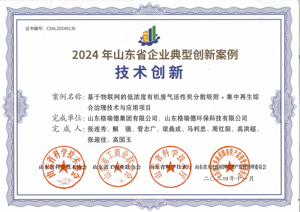 11月,山東省科學(xué)技術(shù)協(xié)會(huì)公示2024年山東省企業(yè)典型創(chuàng)新案例入選名單,格瑞德集團(tuán)與環(huán)??萍脊竟餐邪l(fā)的“基于物聯(lián)網(wǎng)的低濃度有機(jī)廢氣活性炭分散吸附+集中再生綜合治理技術(shù)與應(yīng)用項(xiàng)目” 憑借在有機(jī)廢氣治理方面的先進(jìn)性和創(chuàng)新性成功入選。