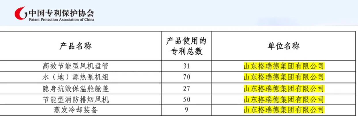 格瑞德集團(tuán)水(地)源熱泵機(jī)組、高效節(jié)能型風(fēng)機(jī)盤管、節(jié)能型消防排煙風(fēng)機(jī)、蒸發(fā)冷卻裝備、隱身抗毀保溫艙艙蓋5個(gè)產(chǎn)品入選國家專利密集型產(chǎn)品。格瑞德集團(tuán)產(chǎn)品的成功認(rèn)定不僅激發(fā)了集團(tuán)新動(dòng)力,增添了新動(dòng)能,也體現(xiàn)了集團(tuán)專利工作的顯著成果。