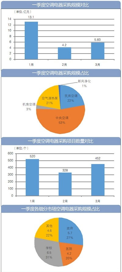 空調(diào)電器采購呈現(xiàn)向好態(tài)勢。據(jù)《政府采購信息報》不完全統(tǒng)計,一季度,全國空調(diào)電器采購項目約1300個,采購總規(guī)模約23.1億元,較去年同期增長35%。其中,1月采購項目數(shù)量和采購規(guī)模均位居首位。醫(yī)院中央空調(diào)、學(xué)校煤改電以及民用空調(diào)批采成為三大主力。