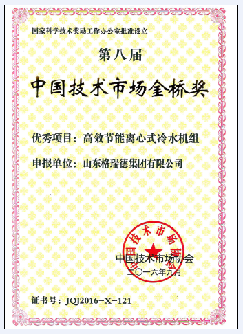 11月18日,第八屆中國技術(shù)市場金橋獎頒獎大會在北京人民大會堂盛大召開,我公司的“高效節(jié)能離心式冷水機組”榮獲“中國技術(shù)市場金橋獎”優(yōu)秀項目獎,該獎項屬于全國技術(shù)市場領(lǐng)域較高獎項。