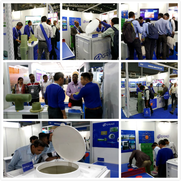 此次展會展出的產品主要有:SMC水箱、纏繞管道、玻璃鋼格柵、井蓋、拉擠型材、SMC乒乓球臺。SMC水箱因其質量輕、耐腐蝕、無毒性的特點引來大量客戶駐足觀看;玻璃鋼纏繞產品的展出吸引了許多印度當地纏繞產品廠家上門進行技術溝通與交流。