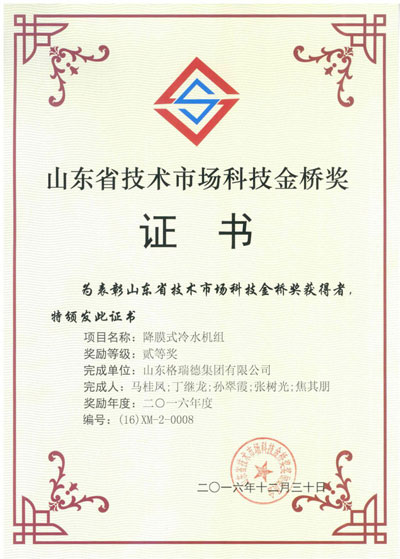 為認真貫徹落實省委省政府決策部署,全面深化科技體制改革、深入實施創(chuàng)新驅(qū)動發(fā)展戰(zhàn)略,充分發(fā)揮科技金橋獎橋梁紐帶作用,表彰在全省技術(shù)市場工作中做出突出貢獻的集體、個人和優(yōu)秀科技成果轉(zhuǎn)化項目,近日,依據(jù)《山東省技術(shù)市場科技金橋獎獎勵辦法》并經(jīng)專業(yè)組評審、評審委員會評審、獎勵委員會評審,山東省技術(shù)市場科技金橋獎獎勵委員會發(fā)布了《關(guān)于2016年度山東省技術(shù)市場科技金橋獎獎勵的決定》,山東格瑞德集團有限公司獲得山東省技術(shù)市場科技金橋獎先進集體獎;集團降膜式冷水機組榮獲山東省技術(shù)市場科技金橋獎優(yōu)秀項目二等獎。