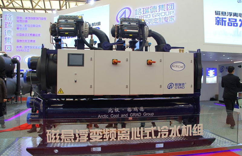 4月12日上午,第28屆中國制冷展上格瑞德在展臺召開新品發(fā)布會,攜手北極制冷、丹佛斯推出了磁懸浮變頻離心式冷水機組。
